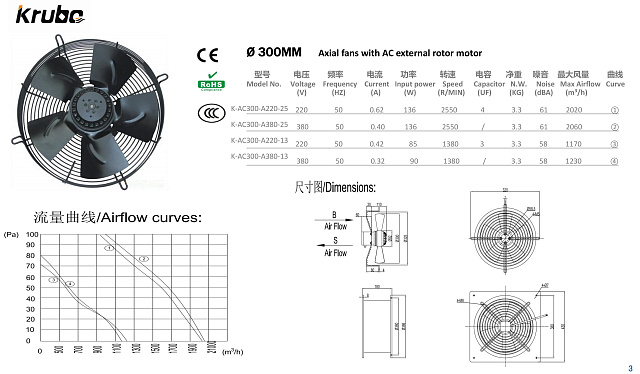 Вентилятор осевой K-AC300-A220-25, AC 220V, 50Hz, 2550RPM%, 2020CFM, 61dB, производства компании Krubo.